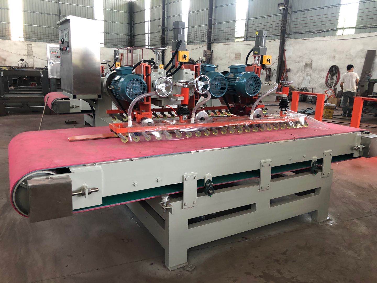 特点:最大可切割1.8米大板(1.8米大板可对开成1800*900mm);有输送带流水线式自动批量切割,切割速度快;采用数控调节尺寸,无需人工量尺,精度高,误差在0.1mm以内;采用三刀头结构,不崩边,切割带修边一次性过,直接切割出原厂边效果,无需二次加工,更省事;效率是手推切割机的4倍。【实际就是1200型三刀数控瓷砖切割机的加长加宽版】